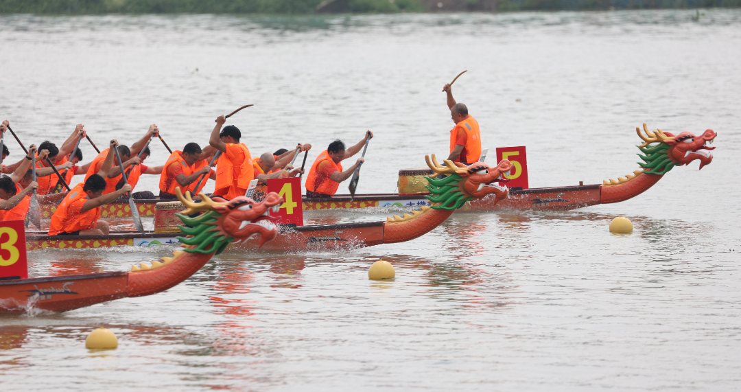 “嗶!”發(fā)令聲響,比賽正式開始。一條條龍舟破水而出,沿著600米的賽道,各組隊伍奮力揮槳、劈波斬浪,在一聲聲吶喊中奮勇向前,激起層層浪花。