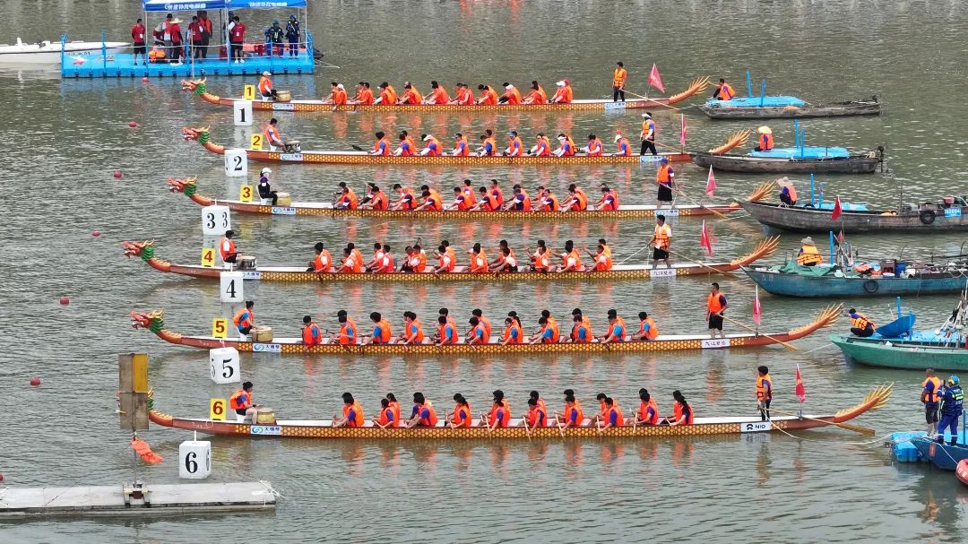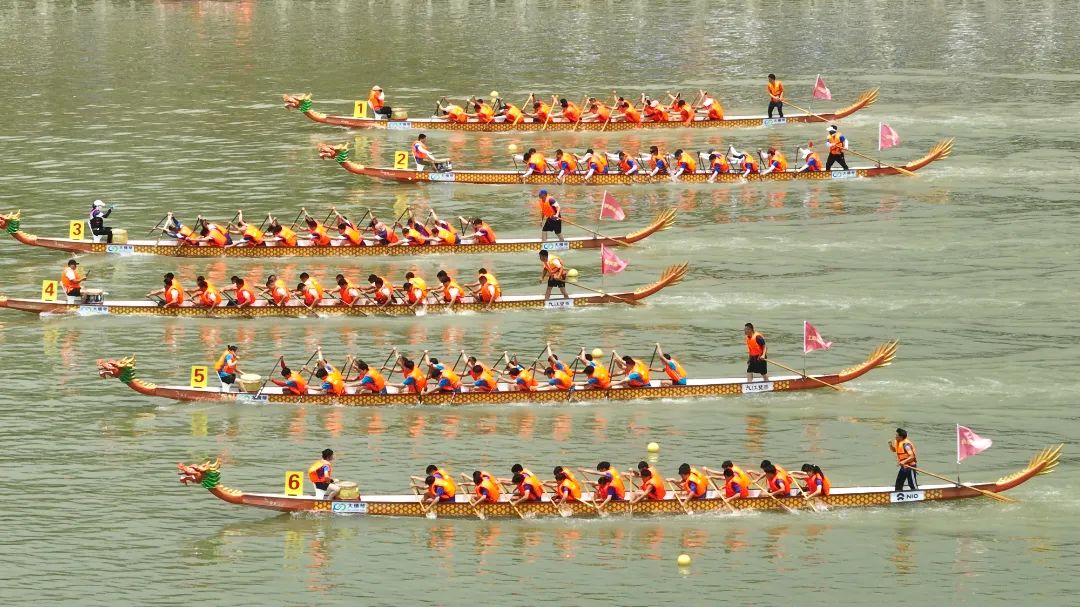 11點20分,巔峰對決正式拉開。6支龍舟如離弦之箭般在水面上沖刺,每一支隊伍不再保留實力,從一開始就拿出十足的沖勁。