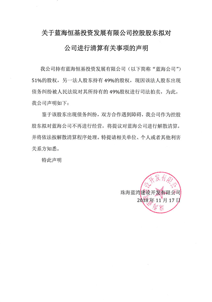 關于藍海恒基投資發展有限公司控股股東擬對公司進行清算有關事項的聲明