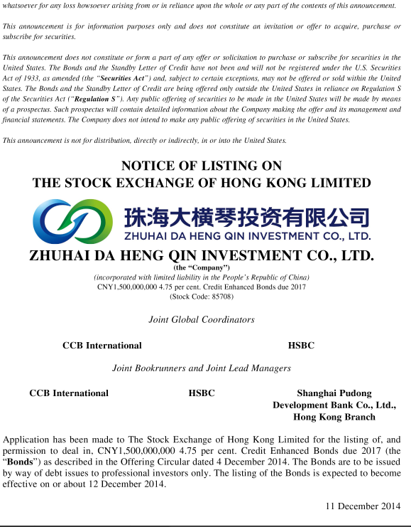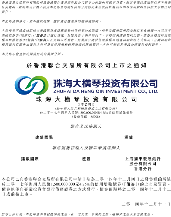 大橫琴投資有限公司債券于 香 港 聯 合 交 易 所 有 限 公 司 上 市 之 通 知